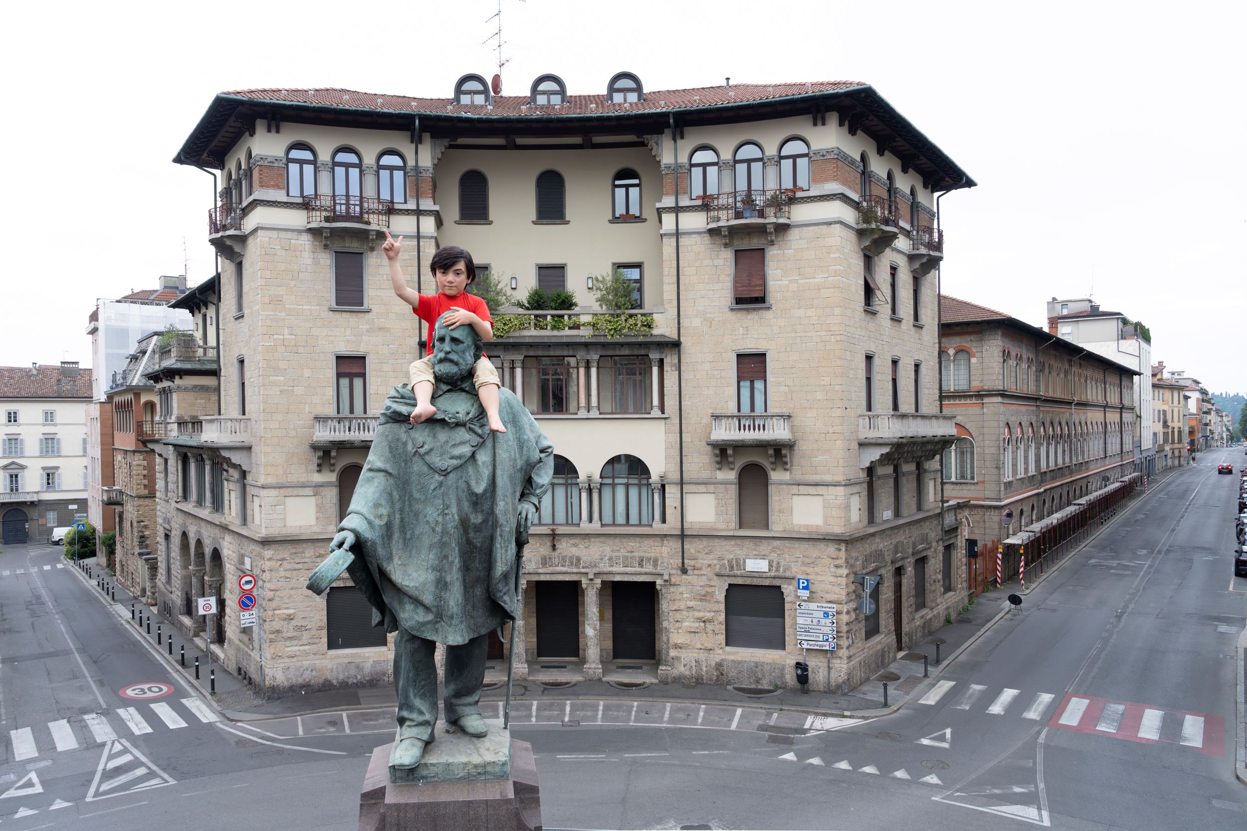 Maurizio Cattelan, One, 2025. Maurizio Cattelan. Seasons, GAMeC – Galleria d’Arte Moderna e Contemporanea di Bergamo e altre sedi, 2025, installazione alla rotonda dei Mille, Bergamo. Photo Lorenzo Palmieri
