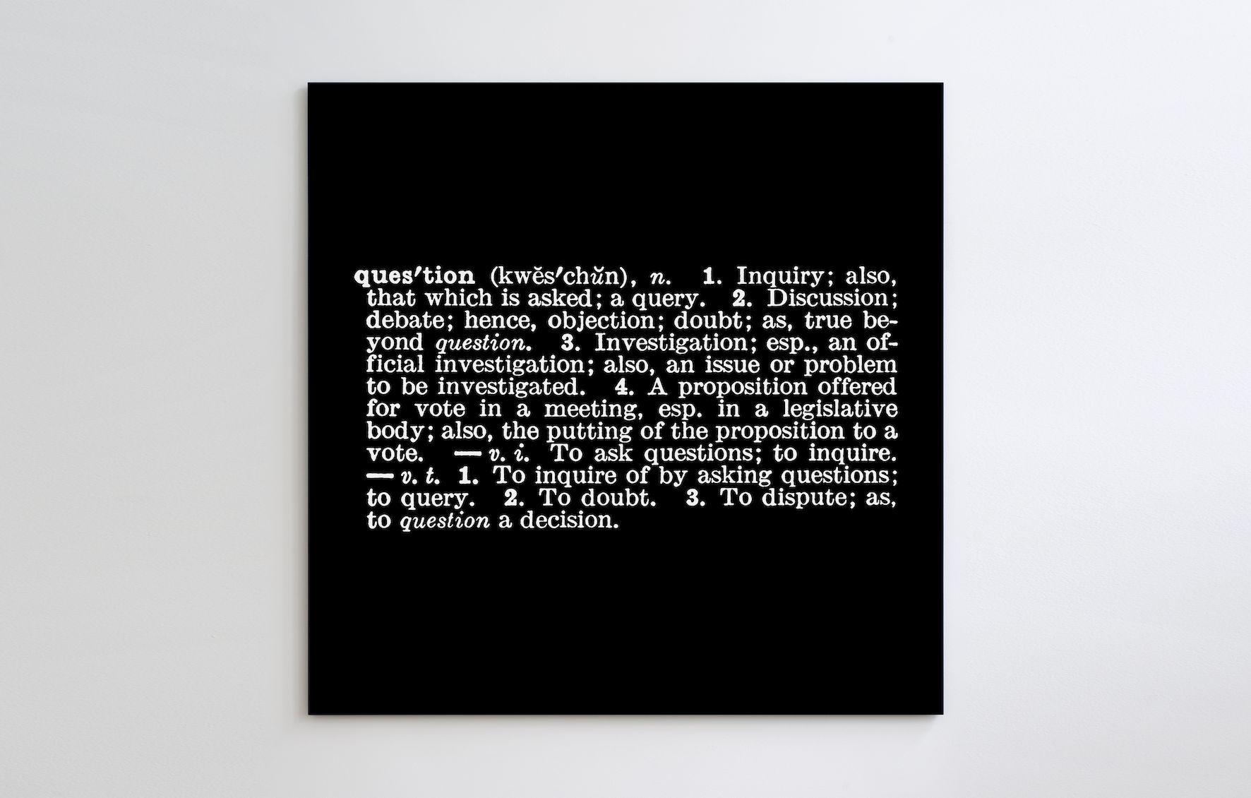 Kosuth: L’arte concettuale, per come la intendo io, è un riesame metodologico del fare arte ‒ e dunque del suo senso ‒ che la svincola da ogni definizione a priori. In quest’ottica, l’arte è un verbo, non un sostantivo.