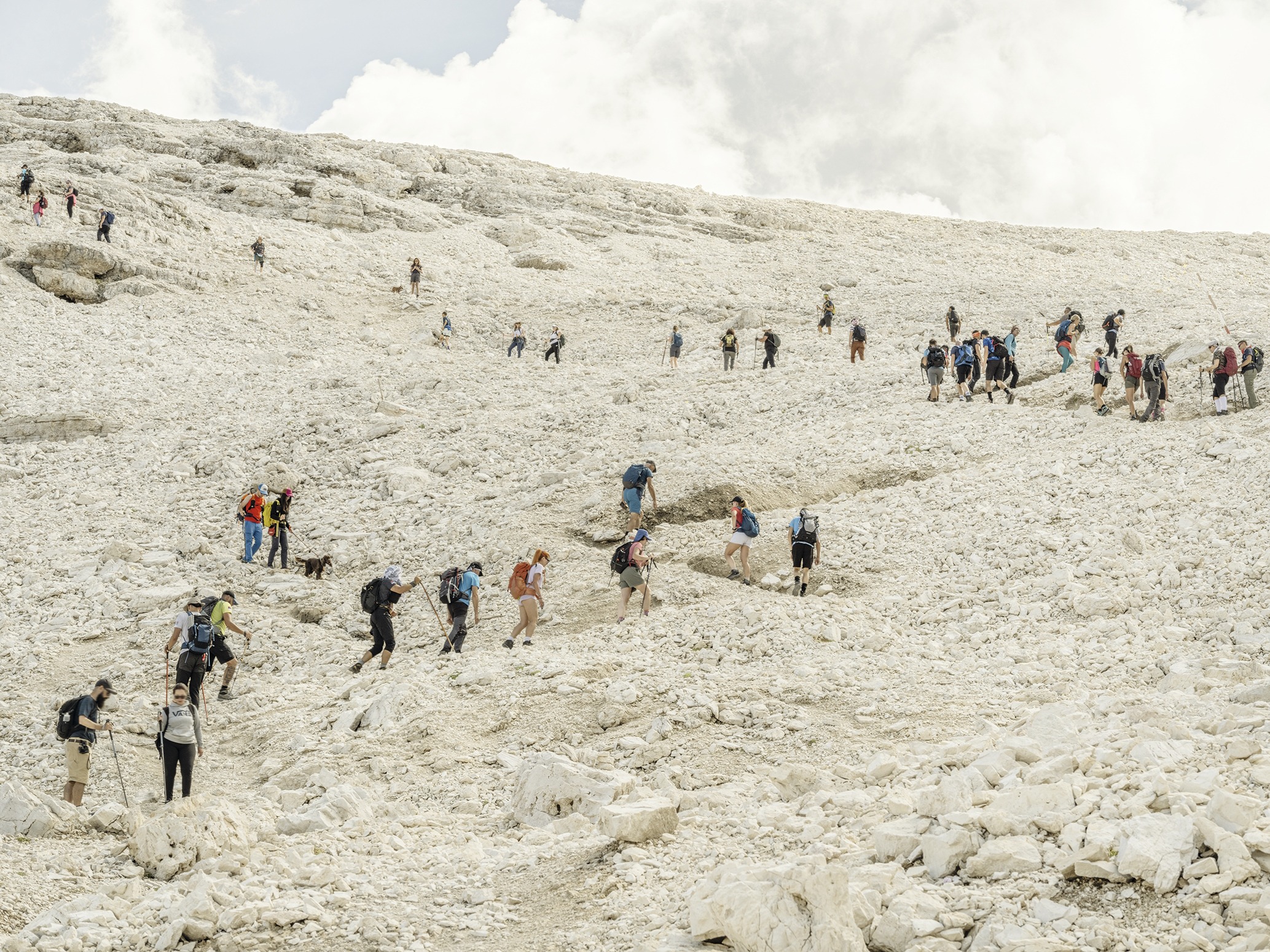 Immaginiamo invece di partire a piedi da Venezia e di puntare verso la Perla delle Dolomiti, come ai tempi del naturalista francese Déodat de Dolomieu alla fine del Settecento, il quale intuì l’unicità della materia dolomitica che avrebbe preso il suo nome. Oggigiorno sono molti i cammini, e c’è tanta voglia di fare quest’esperienza a piedi: c’è il famoso cammino di Santiago di Compostela, per esempio, quasi ottocento chilometri – o anche solo una frazione di quella lunga marcia dei pellegrini –, magari da percorrere a una media di venti chilometri al giorno; si cammina per ore e ore, spesso in gruppo, attraversando i luoghi un passo dopo l’altro, così come si è sempre fatto per millenni, fino alle soglie della modernità, con la locomozione veloce e poi supersonica. Sono pratiche che oggi molte persone sperimentano e, ancora di più, sognano di poter fare. Non è sempre necessario andare a piedi dal capoluogo veneto alle Dolomiti, ma provare a immaginarlo, questo sì, bisognerebbe farlo. E quindi eccoci qui, di mattina presto, alle Zattere a Venezia: possiamo provare a percorrere quindici chilometri al giorno, e in poco più di una settimana saremo nel cuore delle Dolomiti.