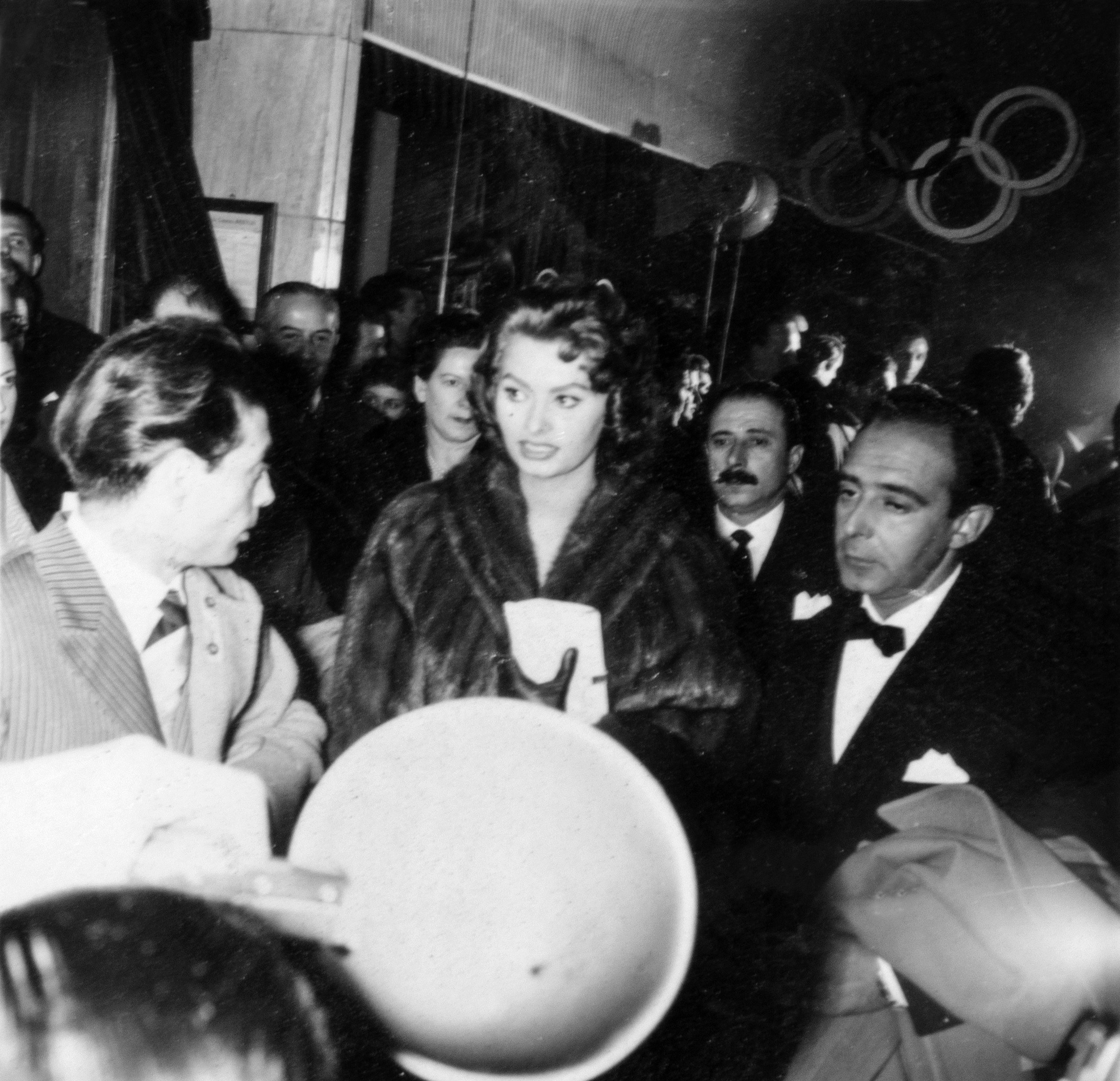 Sophia Loren sotto i flash dei fotografi al suo arrivo a Cortina. Foto Ghedina (immagine tratta dal volume Cortina 1956. Le prime Olimpiadi bianche in Italia)