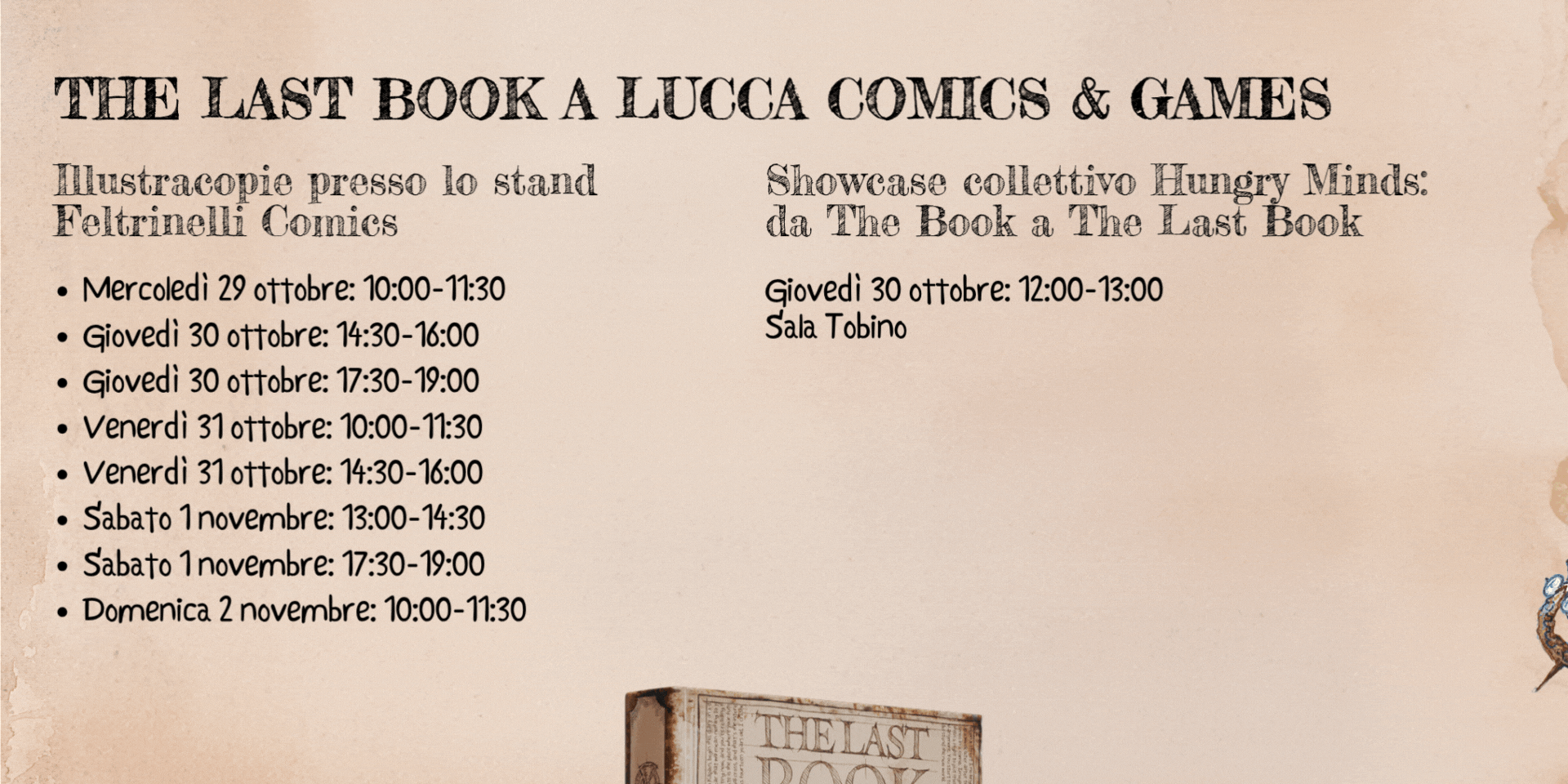Conto alla rovescia per l’edizione 2025 di Lucca Comics & Games, in programma dal 29 ottobre al 2 novembre nel cuore della città toscana. A rendere l’attesa ancora più spasmodica è la serie di eventi dedicati a The Last Book. Il diario dell’ultimo terrestre, il seguito di The Book. Manuale definitivo per la ricostruzione della civiltà, il volume realizzato dal collettivo Hungry Minds, pubblicato in versione italiana da Marsilio Arte nel 2023 e diventato un caso editoriale. The Last Book sarà presentato al pubblico e venduto in anteprima assoluta proprio durante l’imminente edizione del festival e i lettori avranno la possibilità di chiedere a Lev Kaplan, art director e membro del collettivo, di creare una illustrazione esclusiva sulle pagine della copia in loro possesso. Munito di pennelli e matite, ogni giorno Lev Kaplan accoglierà il pubblico insieme a Marsilio Arte nello stand Feltrinelli Comics (Padiglione Napoleone Stand NAP 210) e sarà protagonista, al fianco di Vsevolod “Seva” Batischev ‒ uno dei fondatori di Hungry Minds –, dello showcase previsto giovedì 30 ottobre, dalle 12 alle 13, in Sala Tobino a Palazzo Ducale. Nel corso dell’esibizione dal vivo, i due sveleranno i dettagli della lavorazione di The Last Book, fra spettacolari illustrazioni e incredibili curiosità sulla cultura umana, fulcro di entrambi i volumi ideati da Hungry Minds.