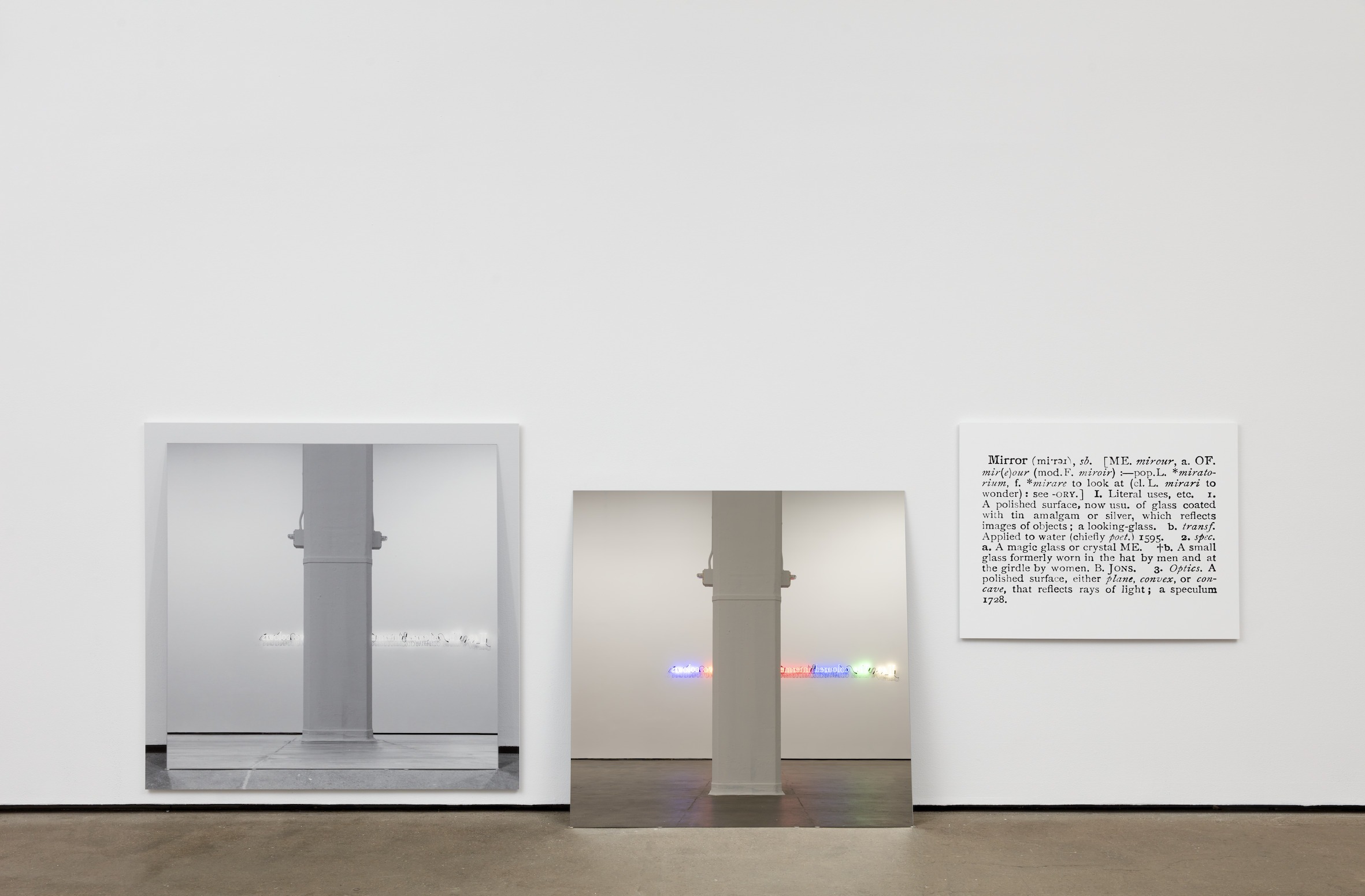 Il primo piano dei Tre Oci ospiterà i primi lavori di Kosuth risalenti agli anni Sessanta. Tra questi, verrà esposta una delle sue opere più influenti, One and Three Mirrors (1965), in cui il significato si concretizza nella relazione tra le sue tre componenti: immagine, oggetto e testo. In questa installazione, il riflesso dello spettatore entra a far parte dell’opera stessa, permettendogli di cogliere un frammento del soggetto.